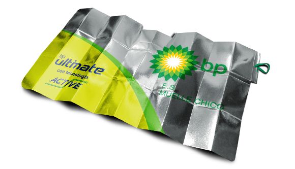 Le pare-soleil publicitaire Super Compact Metallisé est un brevet original de Clipy. Très pratique à plier et facile à ranger ou offrir, ce pare-soleil à l’avant de la voiture se met sur le pare-brise. Il est revêtu d’un film en aluminium réfléchissant sur le recto et en carton écologique métallisé de 500 gr/m, permettant d’imprimer des textes, logotypes, et dessins en 1-4 couleurs directes (PANTONE). La fermeture élastique est disponible en différentes couleurs.
